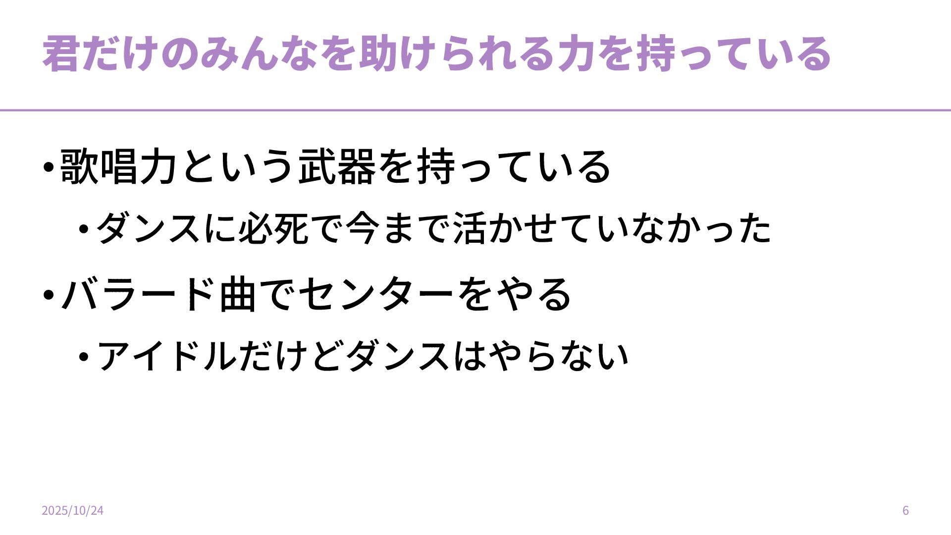 君だけのみんなを助けられる⼒を持っている •歌唱⼒という武器を持っている •ダンスに必死で今まで活かせていなかった •バラード曲でセンターをやる •アイドルだけどダンスはやらない 2025/10/24 6