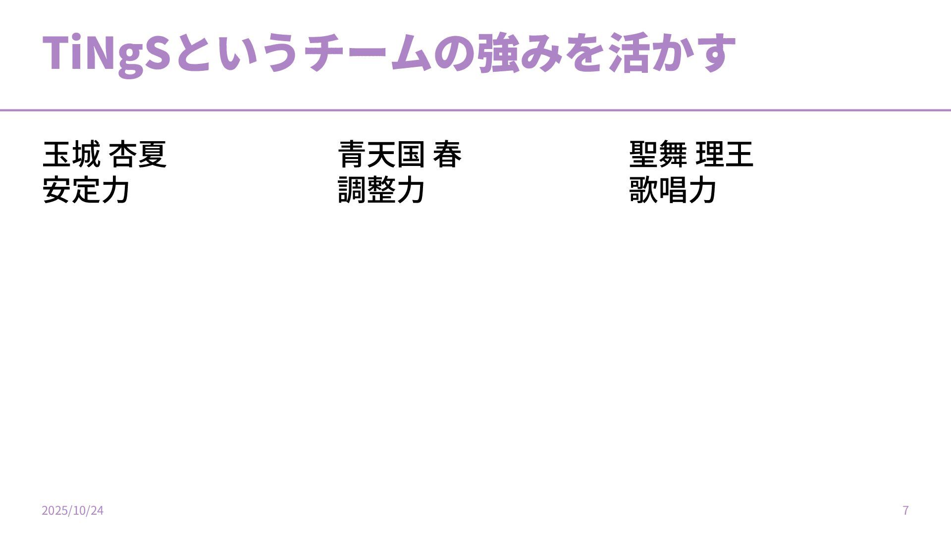 TiNgSというチームの強みを活かす 2025/10/24 7 ⽟城 杏夏 安定⼒ ⻘天国 春 調整⼒ 聖舞