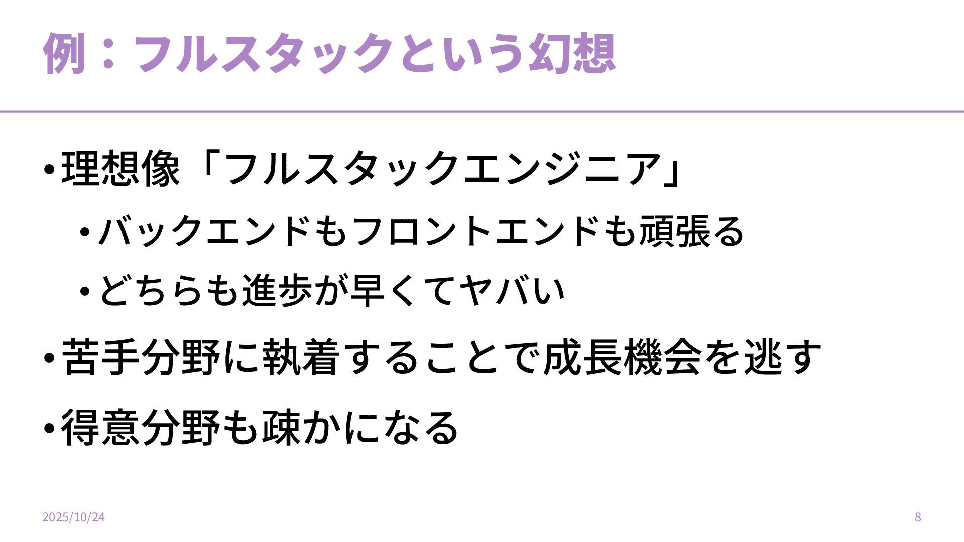 例:フルスタックという幻想 •理想像「フルスタックエンジニア」 •バックエンドもフロントエンドも頑張る •どちらも進歩が早くてヤバい •苦⼿分野に執着することで成⻑機会を逃す •得意分野も疎かになる 2025/10/24 8