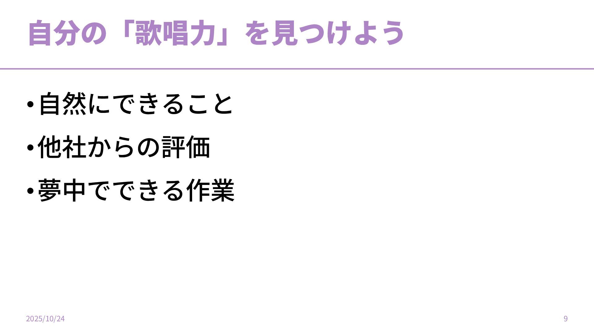 ⾃分の「歌唱⼒」を⾒つけよう •⾃然にできること •他社からの評価 •夢中でできる作業 2025/10/24 9
