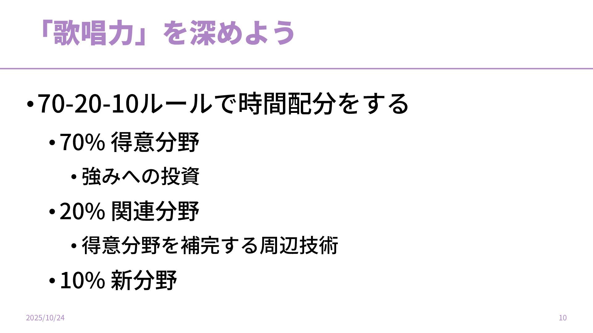 「歌唱⼒」を深めよう •70-20-10ルールで時間配分をする •70% 得意分野 • 強みへの投資 •20% 関連分野 • 得意分野を補完する周辺技術