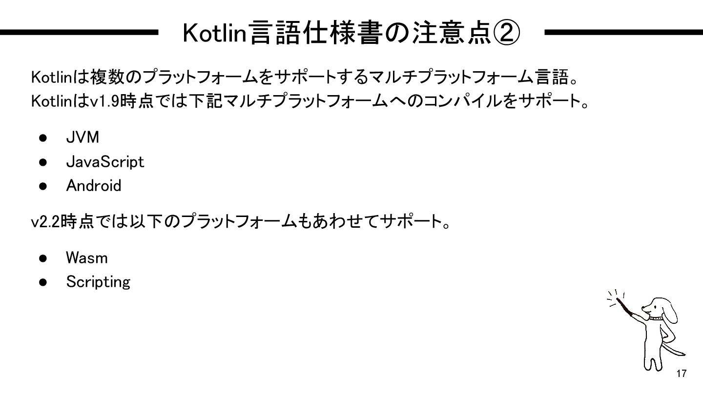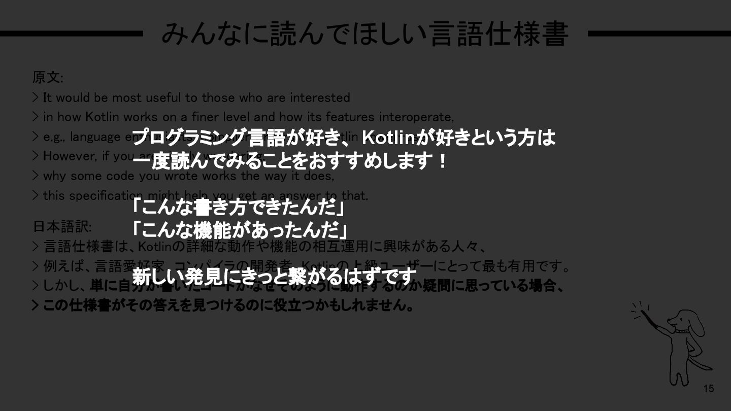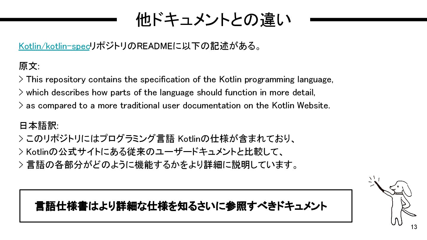 > 言語仕様書は、Kotlinの詳細な動作や機能の相互運用に興味がある人々、