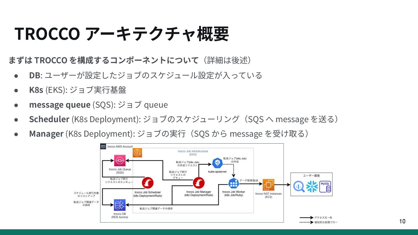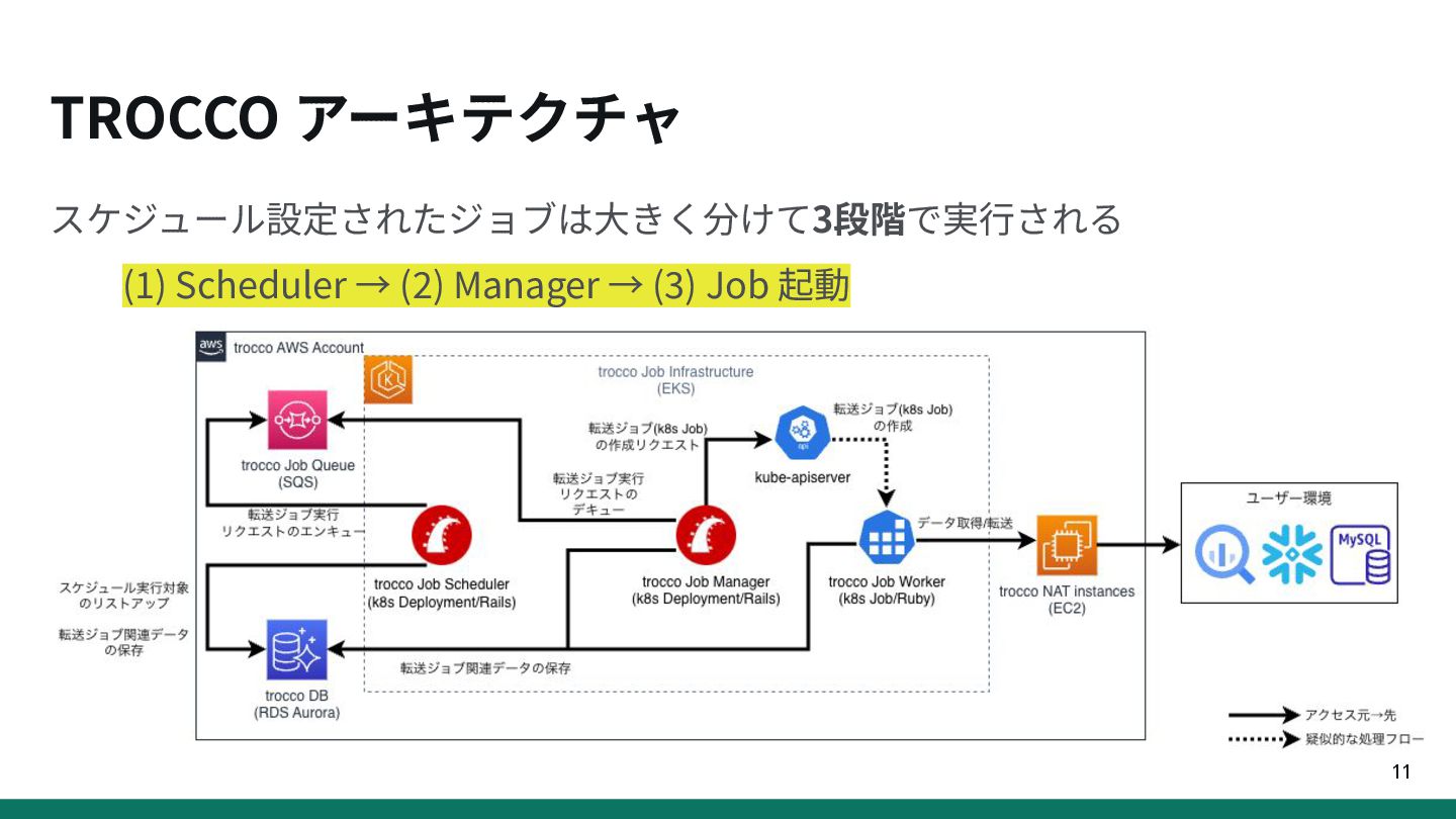 10 10 TROCCO アーキテクチャ概要 まずは TROCCO を構成するコンポーネントについて(詳細は後述) • DB: ユーザーが設定したジョブのスケジュール設定が⼊っている