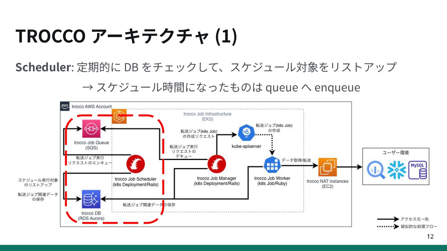 12 12 TROCCO アーキテクチャ (1) Scheduler: 定期的に DB をチェックして、スケジュール対象をリストアップ →