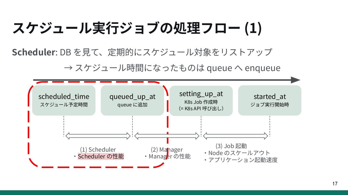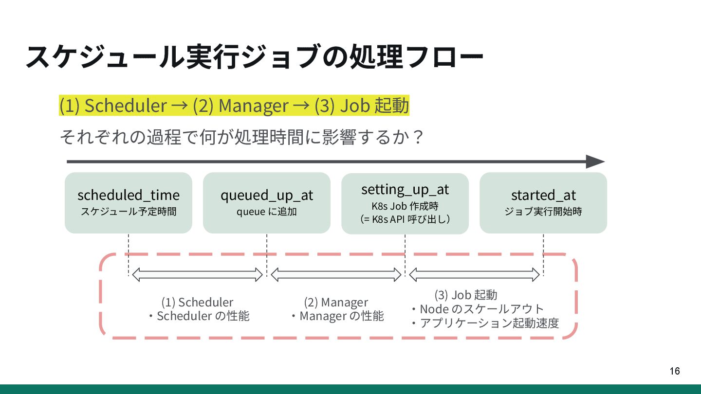 スケジュール実⾏ジョブの処理フロー (1) scheduled_time スケジュール予定時間 queued_up_at queue に追加 started_at ジョブ実⾏開始時 setting_up_at K8s Job 作成時 (= K8s API 呼び出し) (1) Scheduler ‧Scheduler の性能 (2) Manager ‧Manager の性能 (3) Job 起動 ‧Node のスケールアウト ‧アプリケーション起動速度