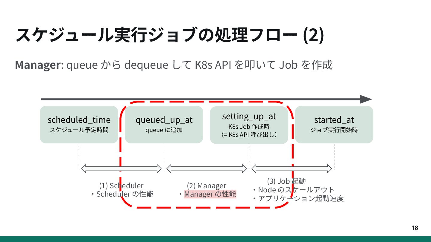 Job を作成 スケジュール実⾏ジョブの処理フロー (2) scheduled_time スケジュール予定時間 queued_up_at queue に追加 started_at ジョブ実⾏開始時 setting_up_at K8s Job 作成時 (= K8s API 呼び出し) (1) Scheduler ‧Scheduler の性能 (2) Manager ‧Manager の性能 (3) Job 起動 ‧Node のスケールアウト ‧アプリケーション起動速度