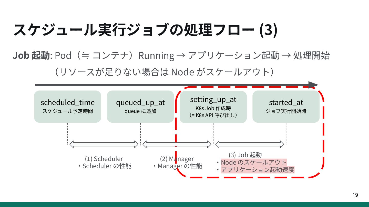 起動 それぞれの過程で何が処理時間に影響するか? スケジュール実⾏ジョブの処理フロー scheduled_time スケジュール予定時間 queued_up_at queue に追加 started_at ジョブ実⾏開始時 setting_up_at K8s Job 作成時 (= K8s API 呼び出し) (1) Scheduler ‧Scheduler の性能 (2) Manager ‧Manager の性能 (3) Job 起動 ‧Node のスケールアウト ‧アプリケーション起動速度