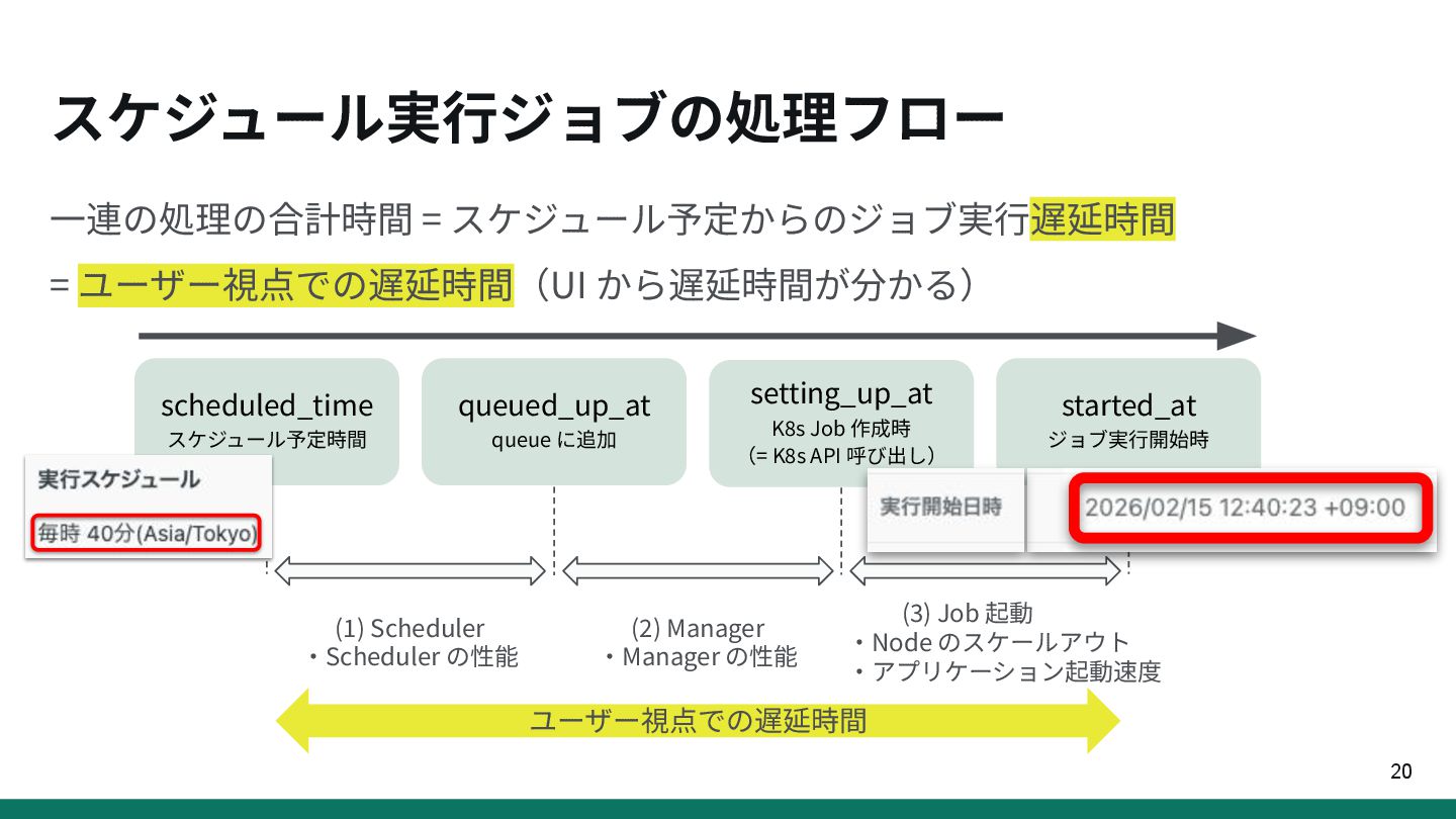 スケジュール予定時間 queued_up_at queue に追加 started_at ジョブ実⾏開始時 setting_up_at K8s Job 作成時 (= K8s API 呼び出し) (1) Scheduler ‧Scheduler の性能 (2) Manager ‧Manager の性能 (3) Job 起動 ‧Node のスケールアウト ‧アプリケーション起動速度 ユーザー視点での遅延時間