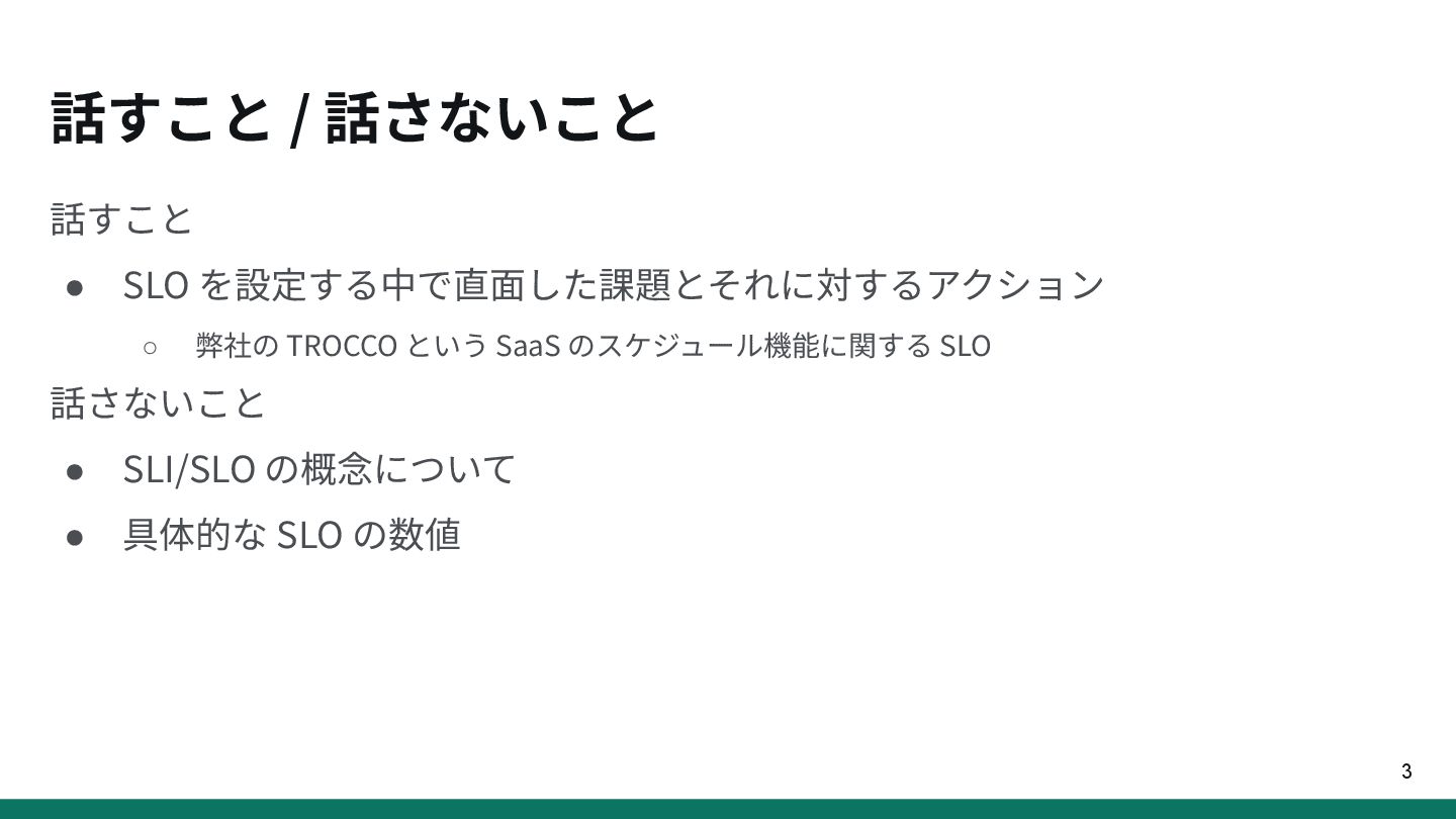 弊社の TROCCO という SaaS のスケジュール機能に関する SLO 話さないこと • SLI/SLO の概念について • 具体的な SLO の数値