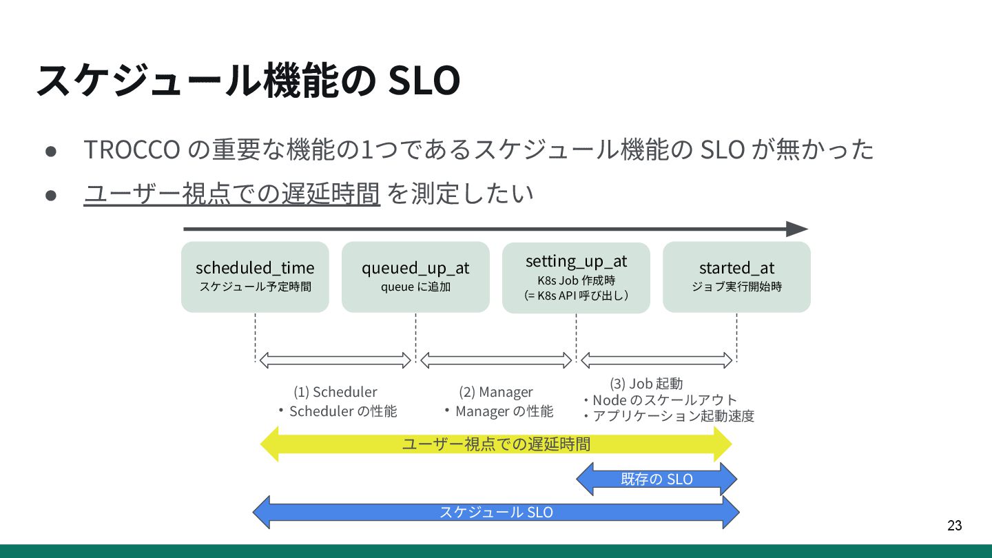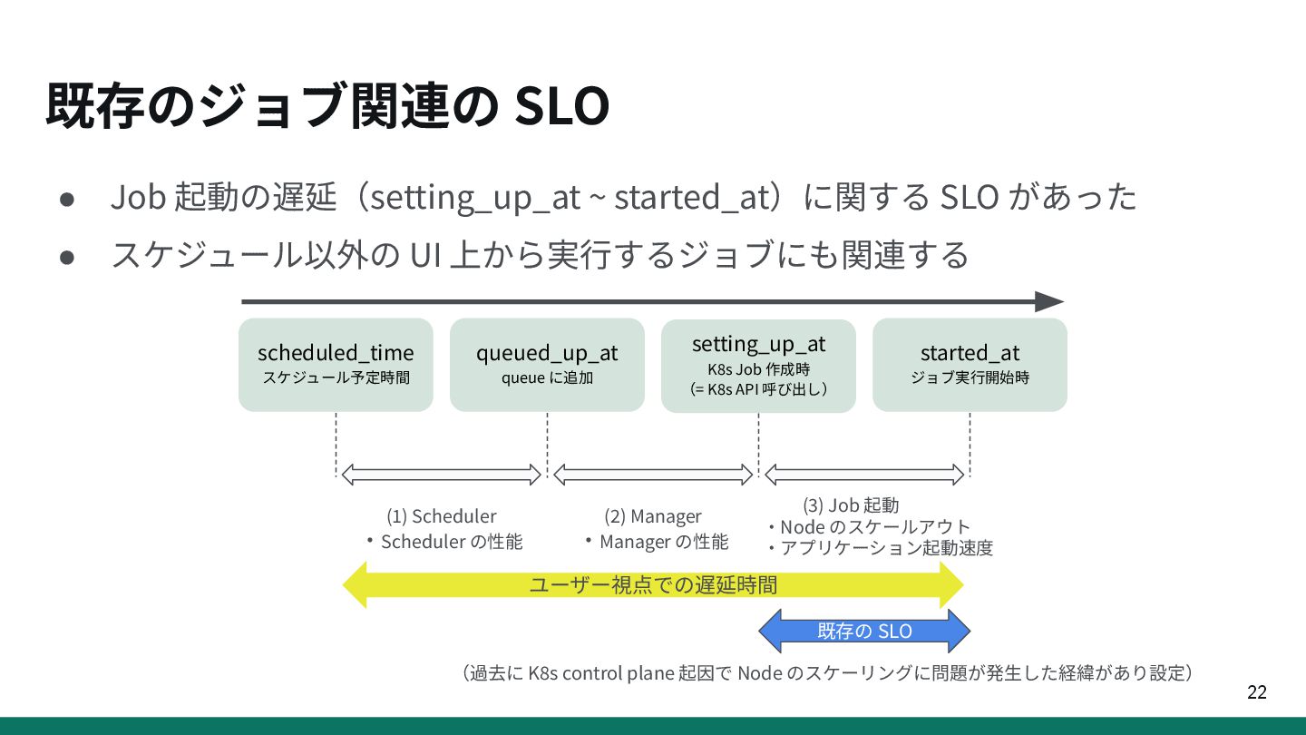 があった • スケジュール以外の UI 上から実⾏するジョブにも関連する 既存の SLO scheduled_time スケジュール予定時間 queued_up_at queue に追加 started_at ジョブ実⾏開始時 setting_up_at K8s Job 作成時 (= K8s API 呼び出し) (1) Scheduler ‧Scheduler の性能 (2) Manager ‧Manager の性能 (3) Job 起動 ‧Node のスケールアウト ‧アプリケーション起動速度 ユーザー視点での遅延時間 (過去に K8s control plane 起因で Node のスケーリングに問題が発⽣した経緯があり設定)