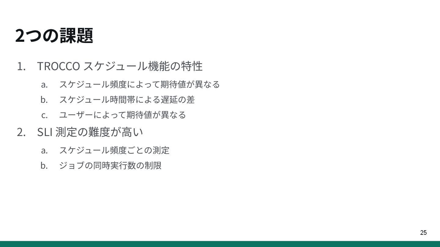 c. ユーザーによって期待値が異なる 2. SLI 測定の難度が⾼い a. スケジュール頻度ごとの測定 b. ジョブの同時実⾏数の制限