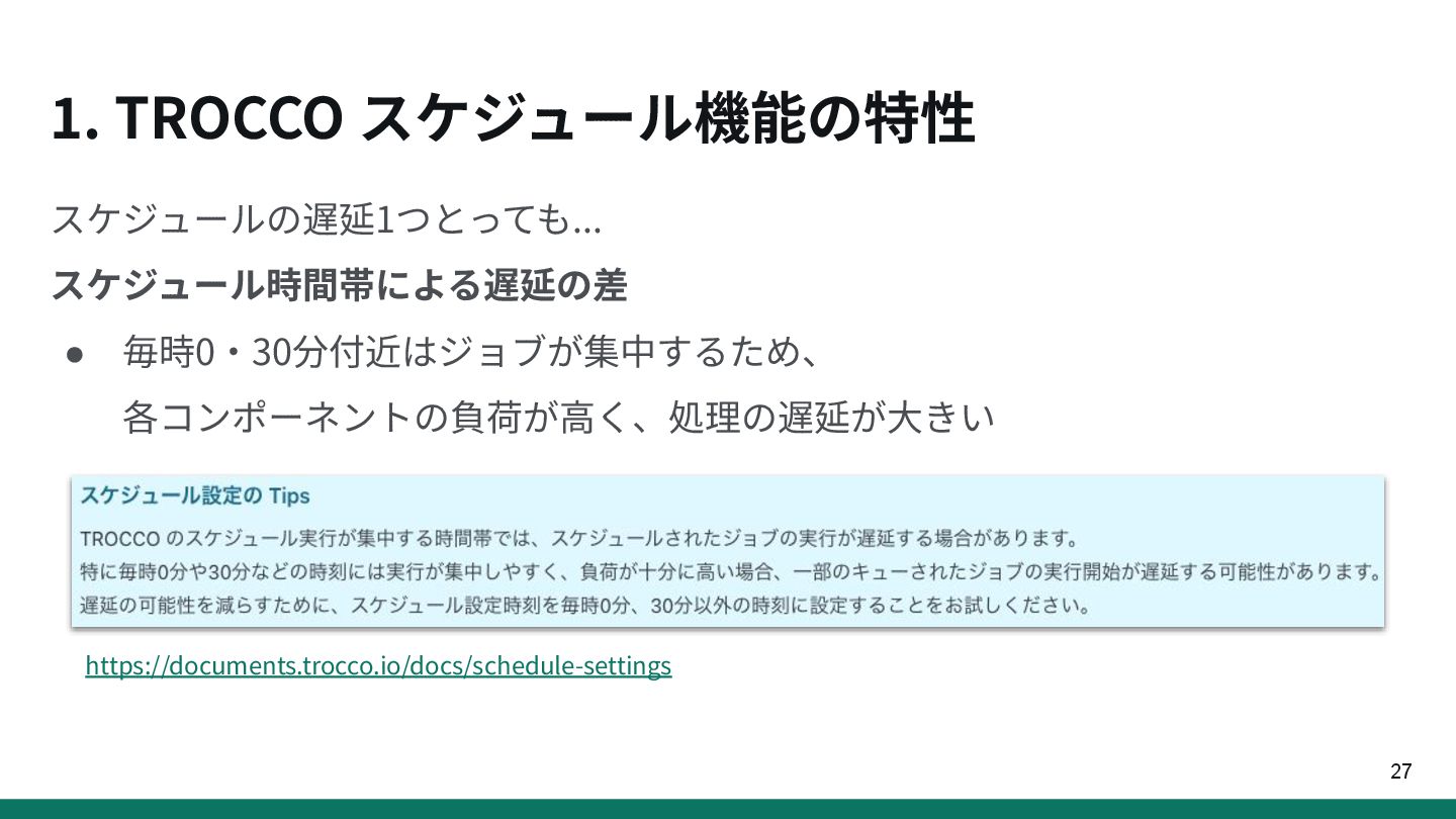 26 26 1. TROCCO スケジュール機能の特性 スケジュールの遅延1つとっても... スケジュール頻度によって期待値が異なる • 毎時(hourly)/ 毎⽇(daily)/