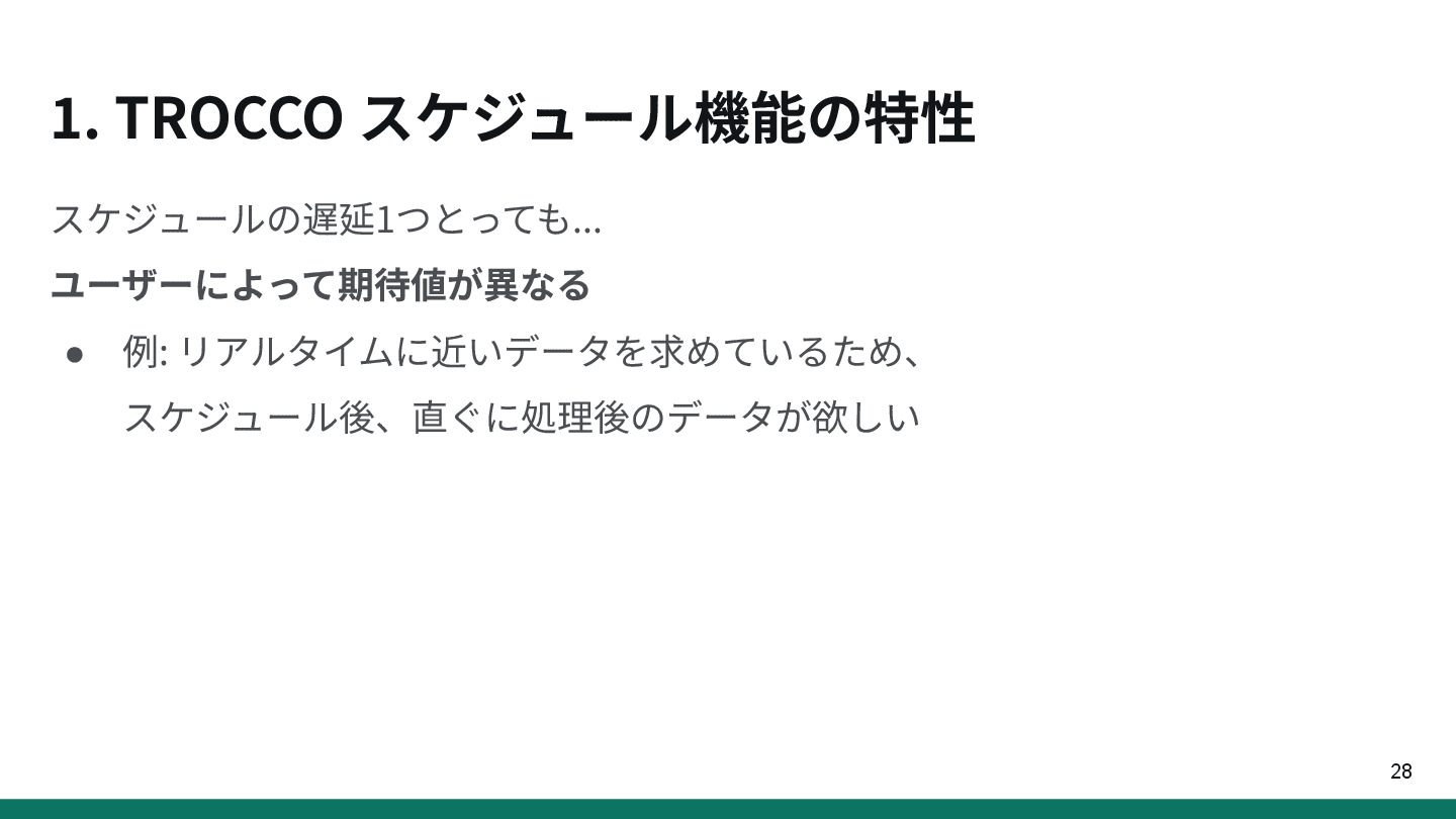 28 28 1. TROCCO スケジュール機能の特性 スケジュールの遅延1つとっても... ユーザーによって期待値が異なる • 例: リアルタイムに近いデータを求めているため、