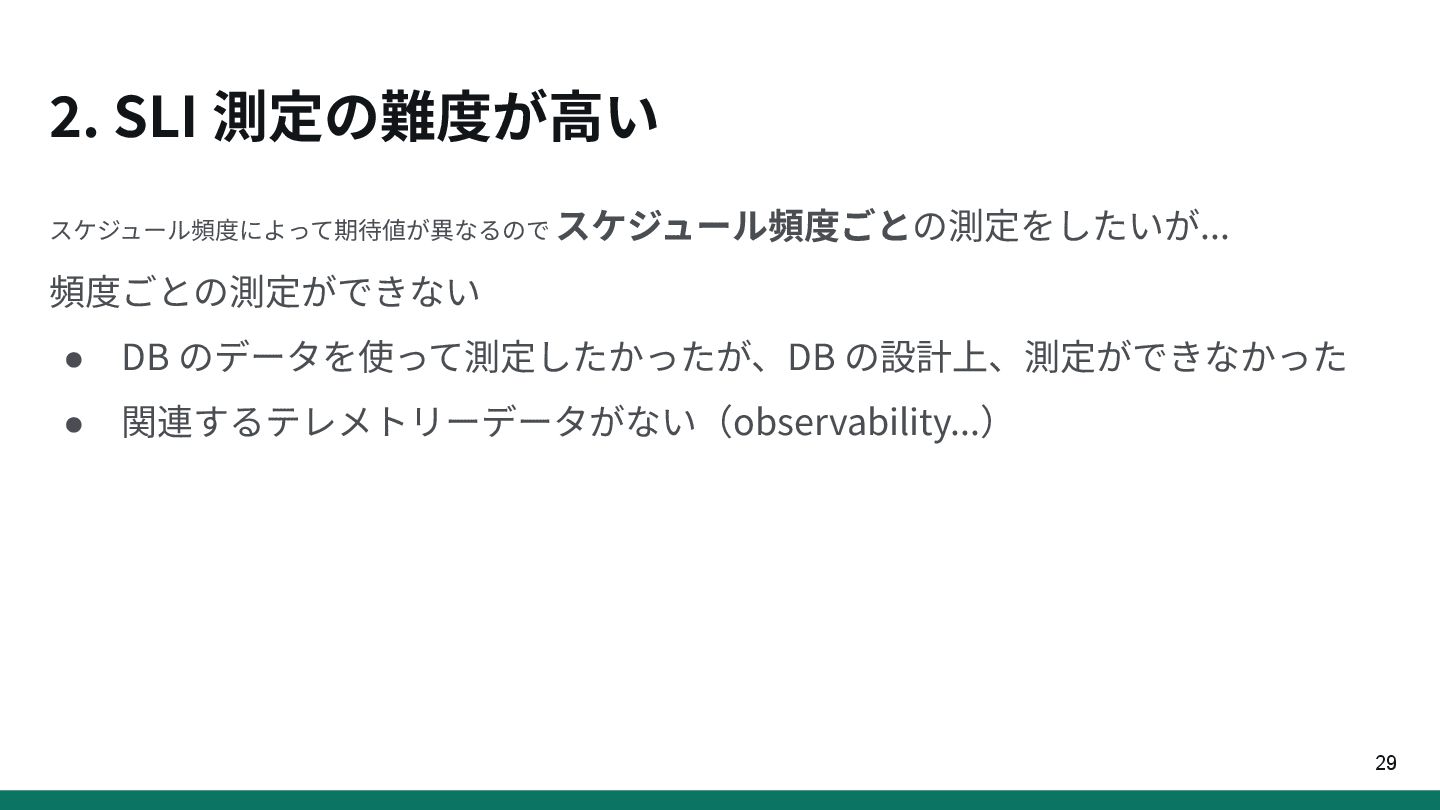 29 29 2. SLI 測定の難度が⾼い スケジュール頻度によって期待値が異なるので スケジュール頻度ごとの測定をしたいが... 頻度ごとの測定ができない • DB
