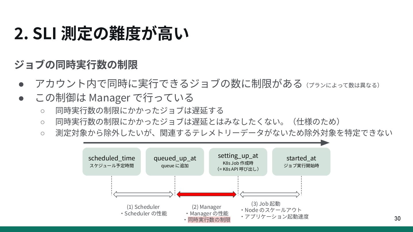 Manager で⾏っている ◦ 同時実⾏数の制限にかかったジョブは遅延する ◦ 同時実⾏数の制限にかかったジョブは遅延とはみなしたくない。(仕様のため) ◦ 測定対象から除外したいが、関連するテレメトリーデータがないため除外対象を特定できない scheduled_time スケジュール予定時間 queued_up_at queue に追加 started_at ジョブ実⾏開始時 setting_up_at K8s Job 作成時 (= K8s API 呼び出し) (1) Scheduler ‧Scheduler の性能 (2) Manager ‧Manager の性能 ‧同時実⾏数の制限 (3) Job 起動 ‧Node のスケールアウト ‧アプリケーション起動速度