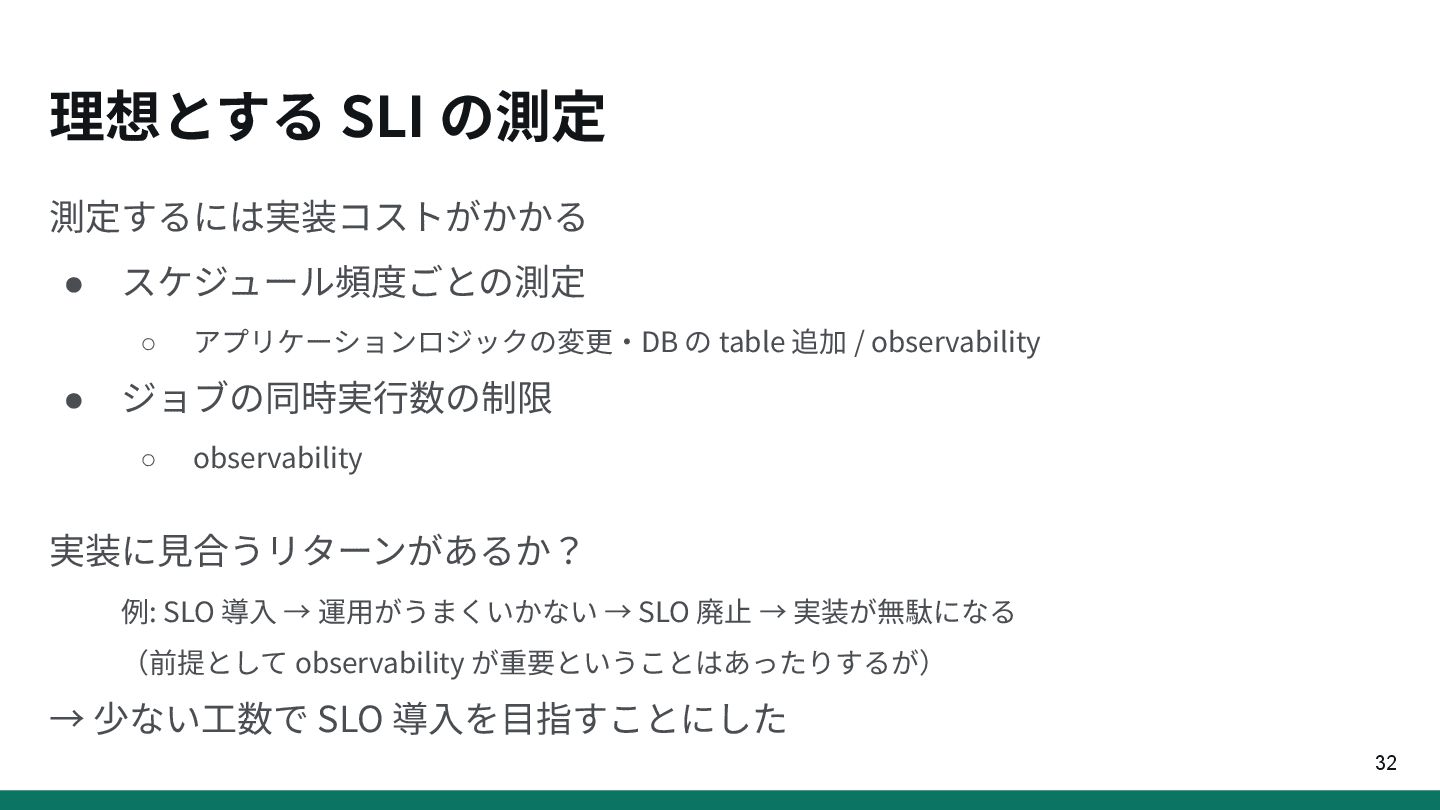 の table 追加 / observability • ジョブの同時実⾏数の制限 ◦ observability 実装に⾒合うリターンがあるか? 例: SLO 導⼊ → 運⽤がうまくいかない → SLO 廃⽌ → 実装が無駄になる (前提として observability が重要ということはあったりするが) → 少ない⼯数で SLO 導⼊を⽬指すことにした
