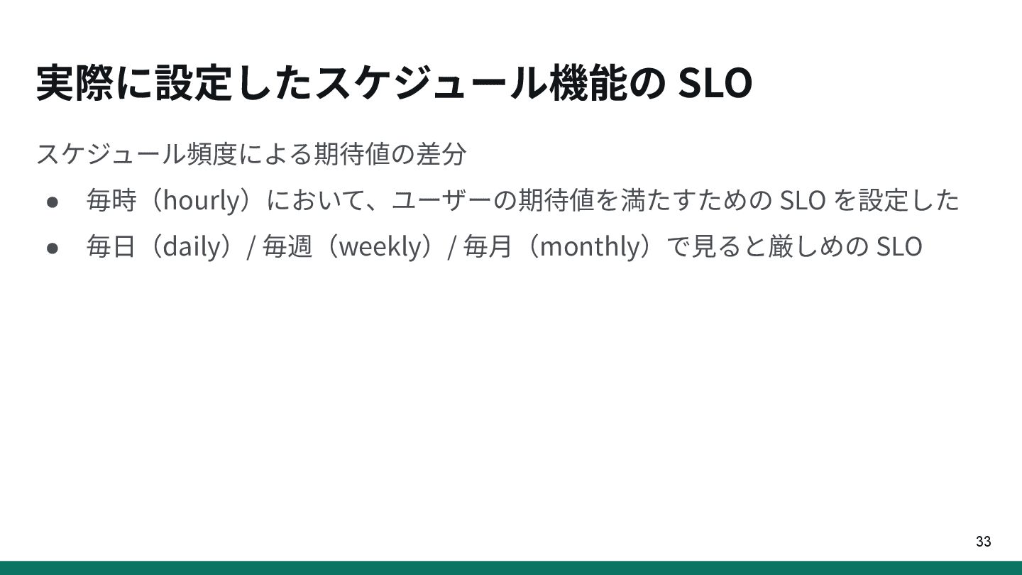 32 32 理想とする SLI の測定 測定するには実装コストがかかる • スケジュール頻度ごとの測定 ◦ アプリケーションロジックの変更‧DB