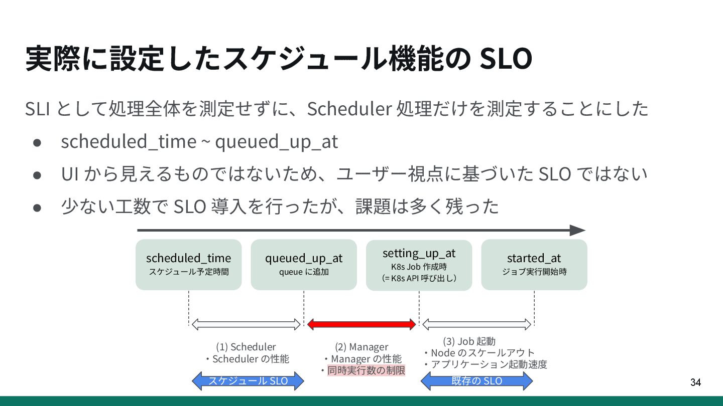 queued_up_at • UI から⾒えるものではないため、ユーザー視点に基づいた SLO ではない • 少ない⼯数で SLO 導⼊を⾏ったが、課題は多く残った スケジュール SLO scheduled_time スケジュール予定時間 queued_up_at queue に追加 started_at ジョブ実⾏開始時 setting_up_at K8s Job 作成時 (= K8s API 呼び出し) (1) Scheduler ‧Scheduler の性能 (2) Manager ‧Manager の性能 ‧同時実⾏数の制限 (3) Job 起動 ‧Node のスケールアウト ‧アプリケーション起動速度 既存の SLO