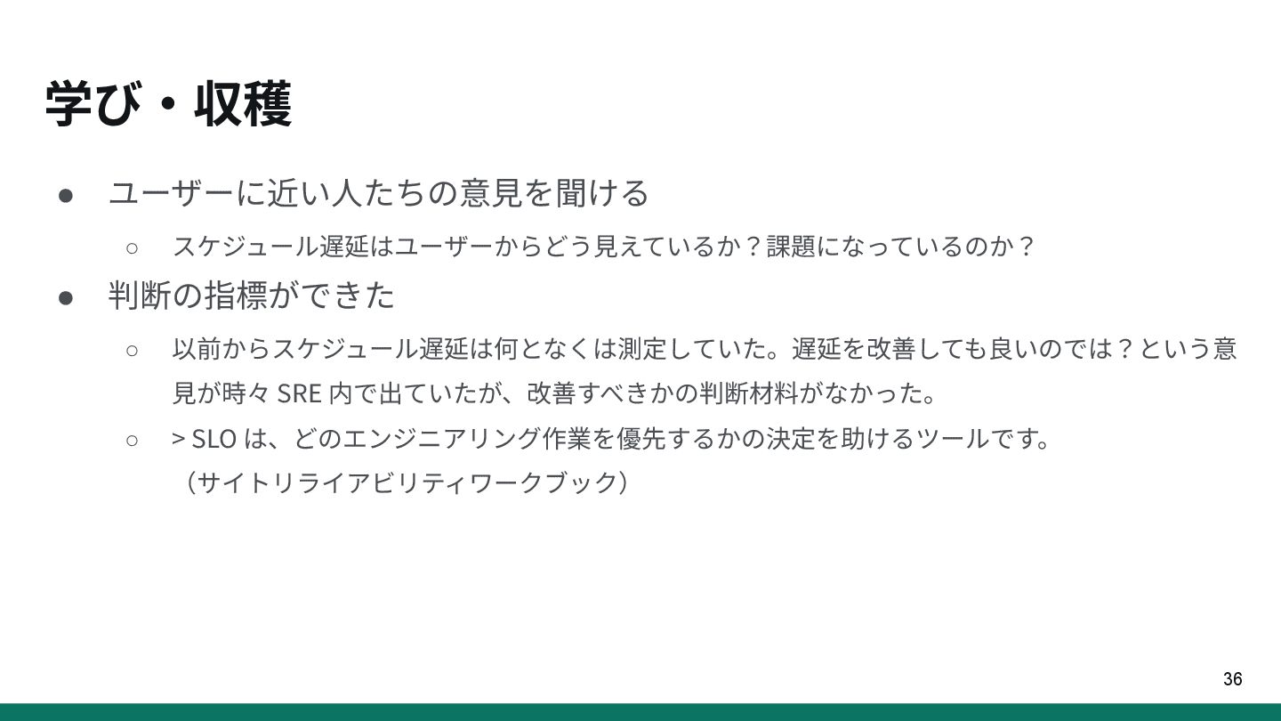 以前からスケジュール遅延は何となくは測定していた。遅延を改善しても良いのでは?という意 ⾒が時々 SRE 内で出ていたが、改善すべきかの判断材料がなかった。 ◦ > SLO は、どのエンジニアリング作業を優先するかの決定を助けるツールです。 (サイトリライアビリティワークブック)