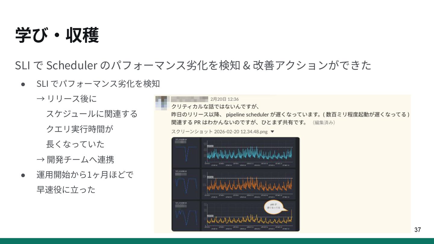 SLI でパフォーマンス劣化を検知 → リリース後に スケジュールに関連する クエリ実⾏時間が ⻑くなっていた → 開発チームへ連携 • 運⽤開始から1ヶ⽉ほどで 早速役に⽴った