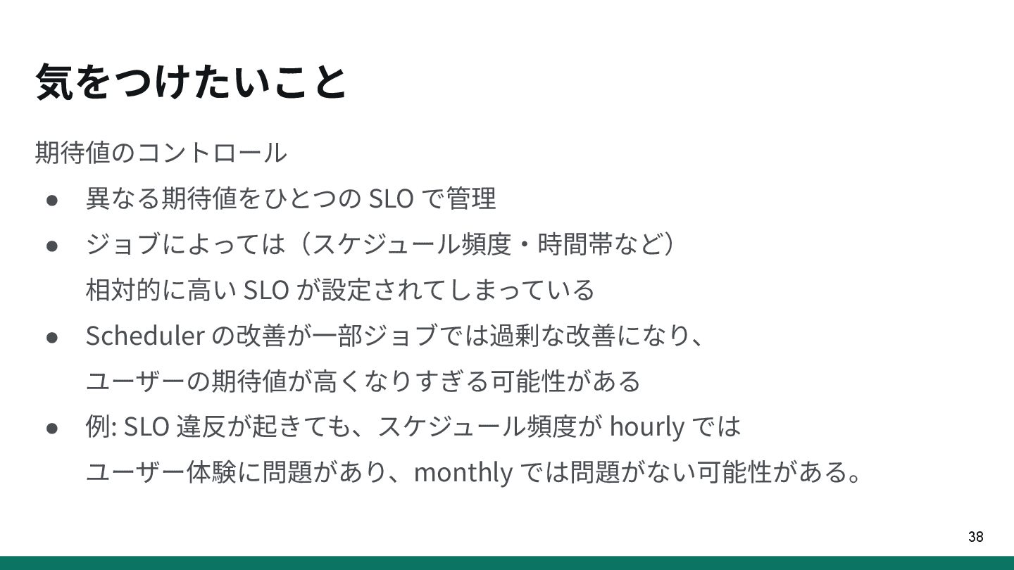 相対的に⾼い SLO が設定されてしまっている • Scheduler の改善が⼀部ジョブでは過剰な改善になり、 ユーザーの期待値が⾼くなりすぎる可能性がある • 例: SLO 違反が起きても、スケジュール頻度が hourly では ユーザー体験に問題があり、monthly では問題がない可能性がある。