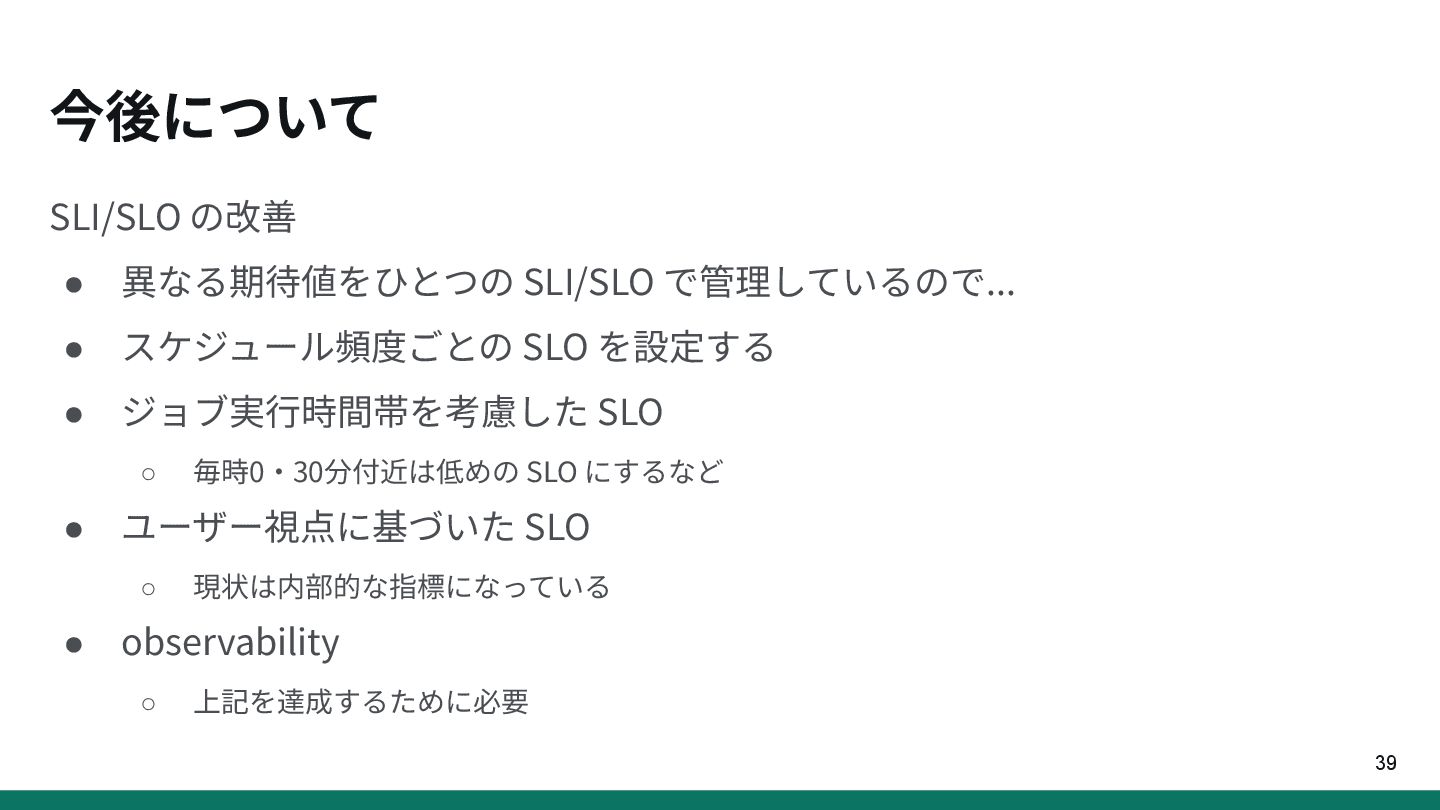 38 38 気をつけたいこと 期待値のコントロール • 異なる期待値をひとつの SLO で管理 • ジョブによっては(スケジュール頻度‧時間帯など)