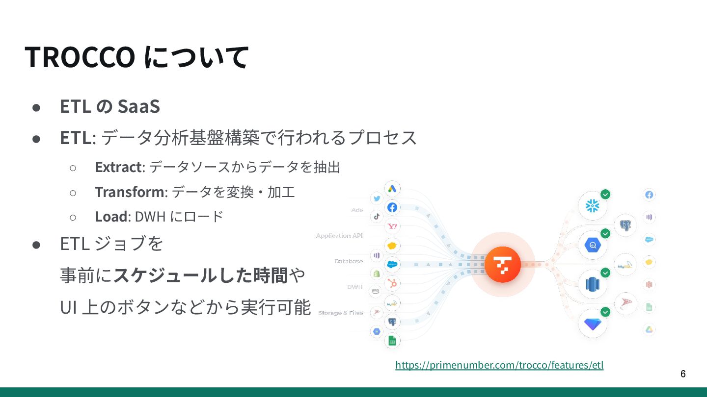6 6 TROCCO について • ETL の SaaS • ETL: