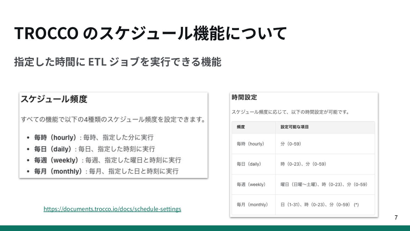7 7 TROCCO のスケジュール機能について 指定した時間に ETL ジョブを実⾏できる機能 https://documents.trocco.io/docs/schedule-settings