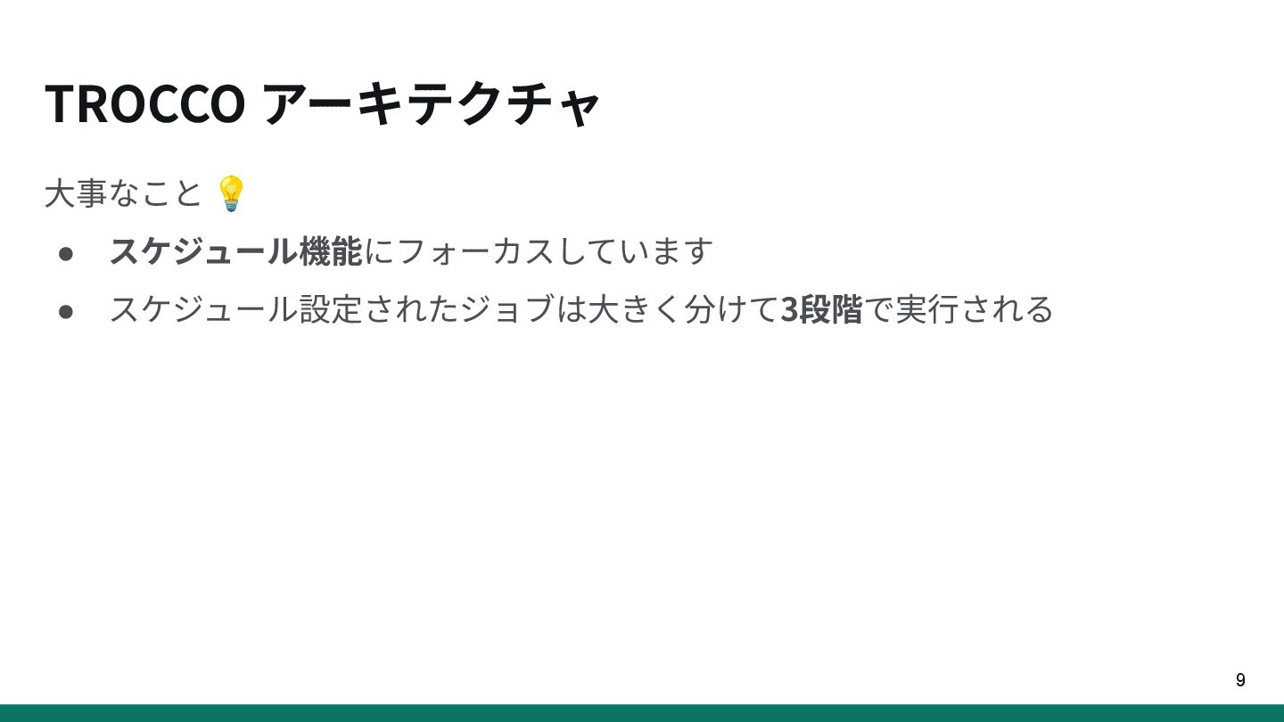 9 9 TROCCO アーキテクチャ ⼤事なこと 💡 • スケジュール機能にフォーカスしています • スケジュール設定されたジョブは⼤きく分けて3段階で実⾏される