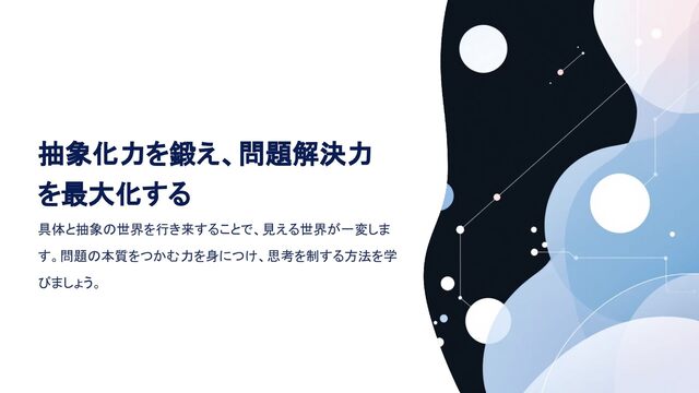 抽象化力を鍛え、問題解決力 を最大化する 具体と抽象の世界を行き来することで、見える世界が一変しま す。問題の本質をつかむ力を身につけ、思考を制する方法を学 びましょう。