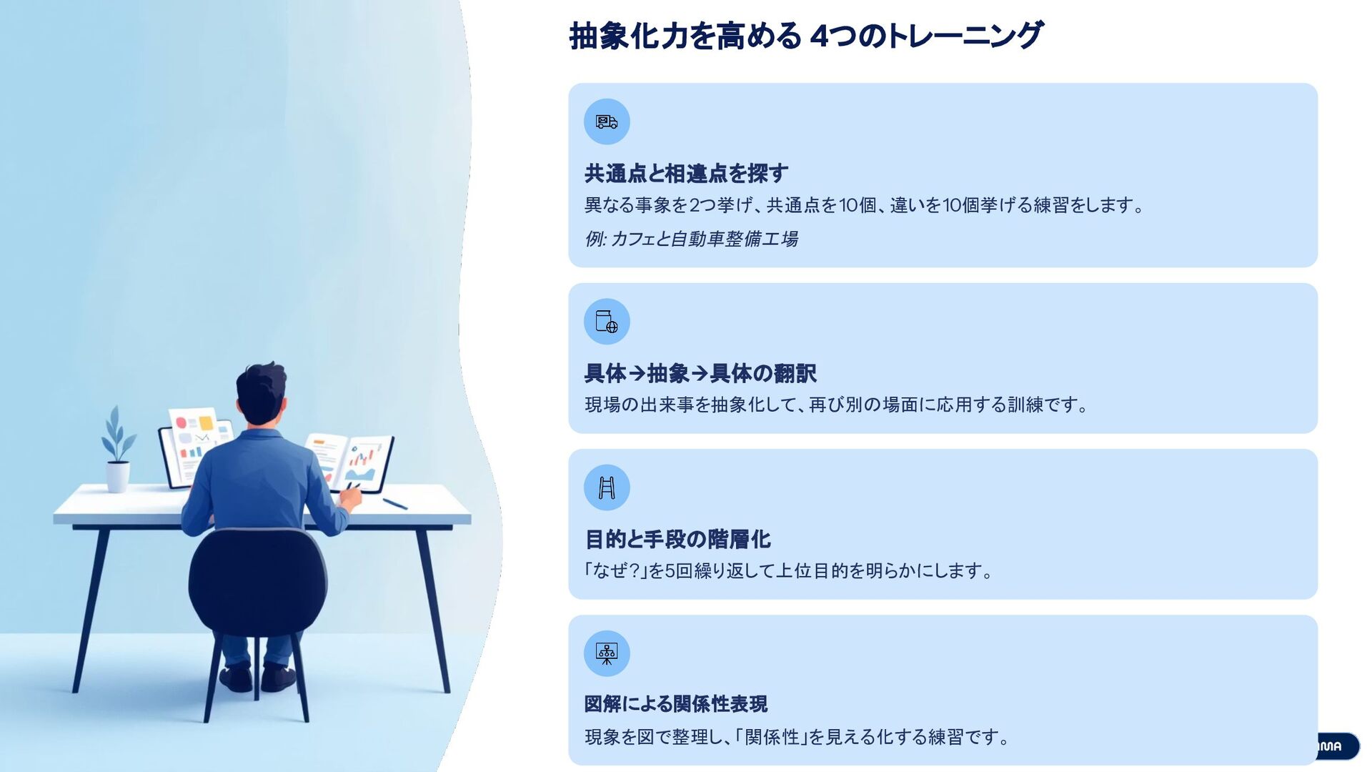 抽象化力を高める 4つのトレーニング 共通点と相違点を探す 異なる事象を2つ挙げ、共通点を10個、違いを10個挙げる練習をします。 例: カフェと自動車整備工場 具体→抽象→具体の翻訳 現場の出来事を抽象化して、再び別の場面に応用する訓練です。 目的と手段の階層化 「なぜ?」を5回繰り返して上位目的を明らかにします。