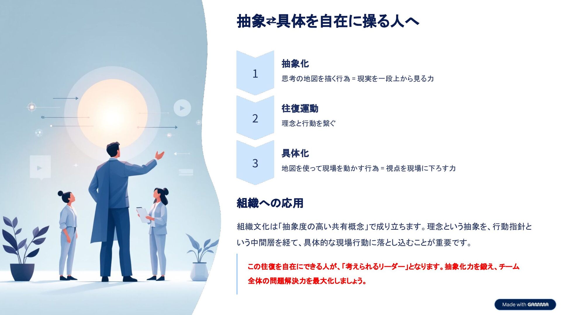 視点を現場に下ろす力 組織への応用 組織文化は「抽象度の高い共有概念」で成り立ちます。理念という抽象を、行動指針と いう中間層を経て、具体的な現場行動に落とし込むことが重要です。 この往復を自在にできる人が、「考えられるリーダー」となります。抽象化力を鍛え、チーム 全体の問題解決力を最大化しましょう。