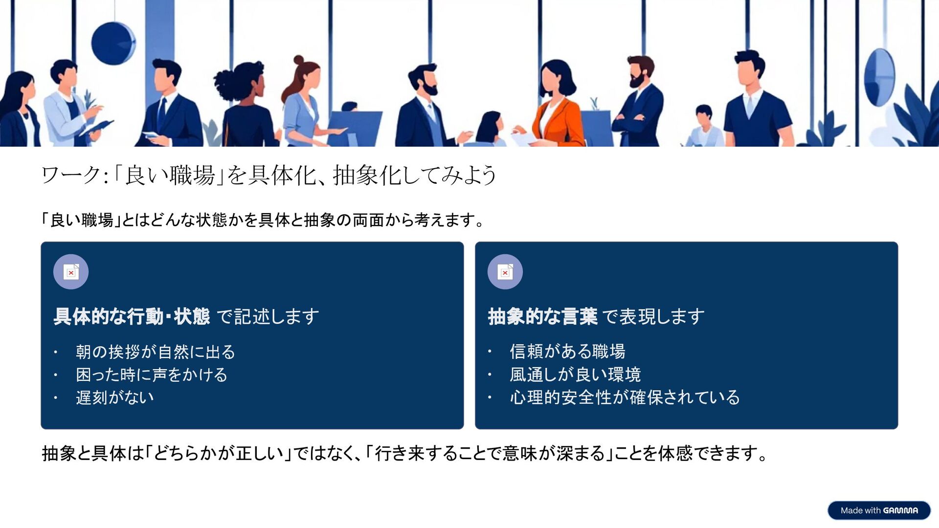 抽象的な言葉 で表現します • 信頼がある職場 • 風通しが良い環境 • 心理的安全性が確保されている 抽象と具体は「どちらかが正しい」ではなく、「行き来することで意味が深まる」ことを体感できます。