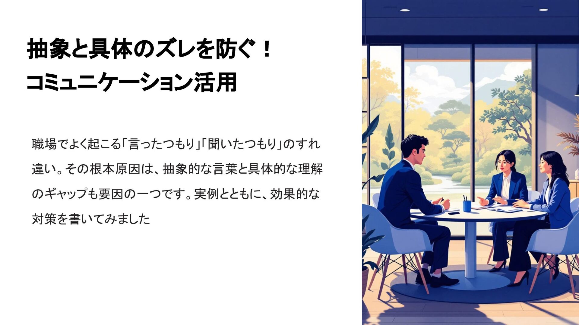 抽象と具体のズレを防ぐ! コミュニケーション活用 職場でよく起こる「言ったつもり」「聞いたつもり」のすれ 違い。その根本原因は、抽象的な言葉と具体的な理解 のギャップも要因の一つです。実例とともに、効果的な 対策を書いてみました