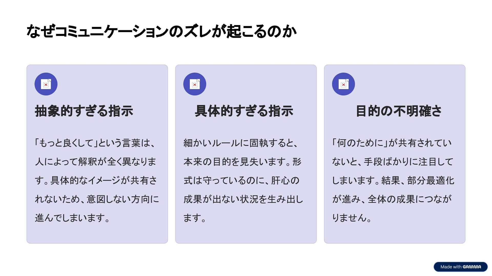 なぜコミュニケーションのズレが起こるのか 抽象的すぎる指示 「もっと良くして」という言葉は、 人によって解釈が全く異なりま す。具体的なイメージが共有さ れないため、意図しない方向に 進んでしまいます。 具体的すぎる指示 細かいルールに固執すると、 本来の目的を見失います。形