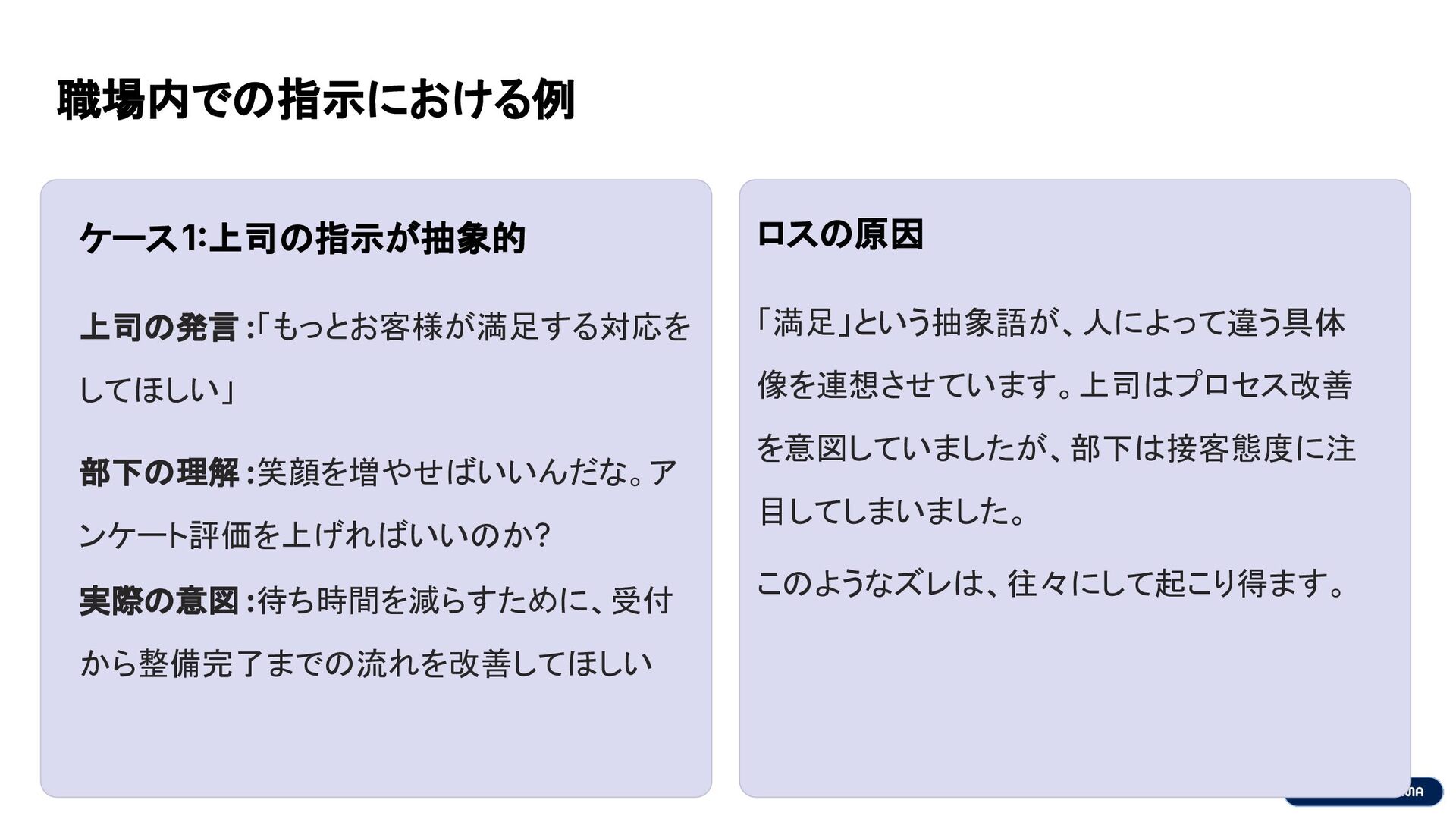 職場内での指示における例 ケース1上司の指示が抽象的 上司の発言 :「もっとお客様が満足する対応を してほしい」 部下の理解 :笑顔を増やせばいいんだな。ア ンケート評価を上げればいいのか? 実際の意図 :待ち時間を減らすために、受付