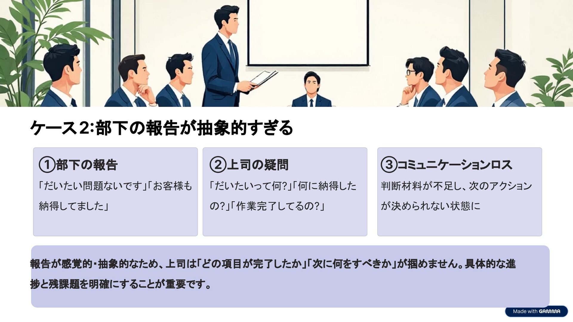 ケース2部下の報告が抽象的すぎる ①部下の報告 「だいたい問題ないです」「お客様も 納得してました」 ②上司の疑問 「だいたいって何?」「何に納得した の?」「作業完了してるの?」 ③コミュニケーションロス 判断材料が不足し、次のアクション が決められない状態に
