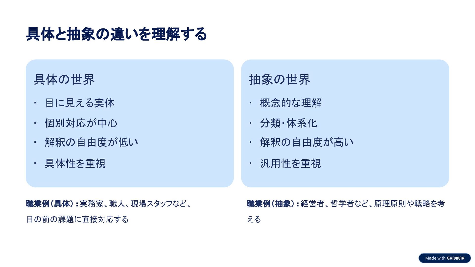 抽象の世界 • 概念的な理解 • 分類・体系化 • 解釈の自由度が高い • 汎用性を重視 職業例(具体) : 実務家、職人、現場スタッフなど、 目の前の課題に直接対応する 職業例(抽象) : 経営者、哲学者など、原理原則や戦略を考 える