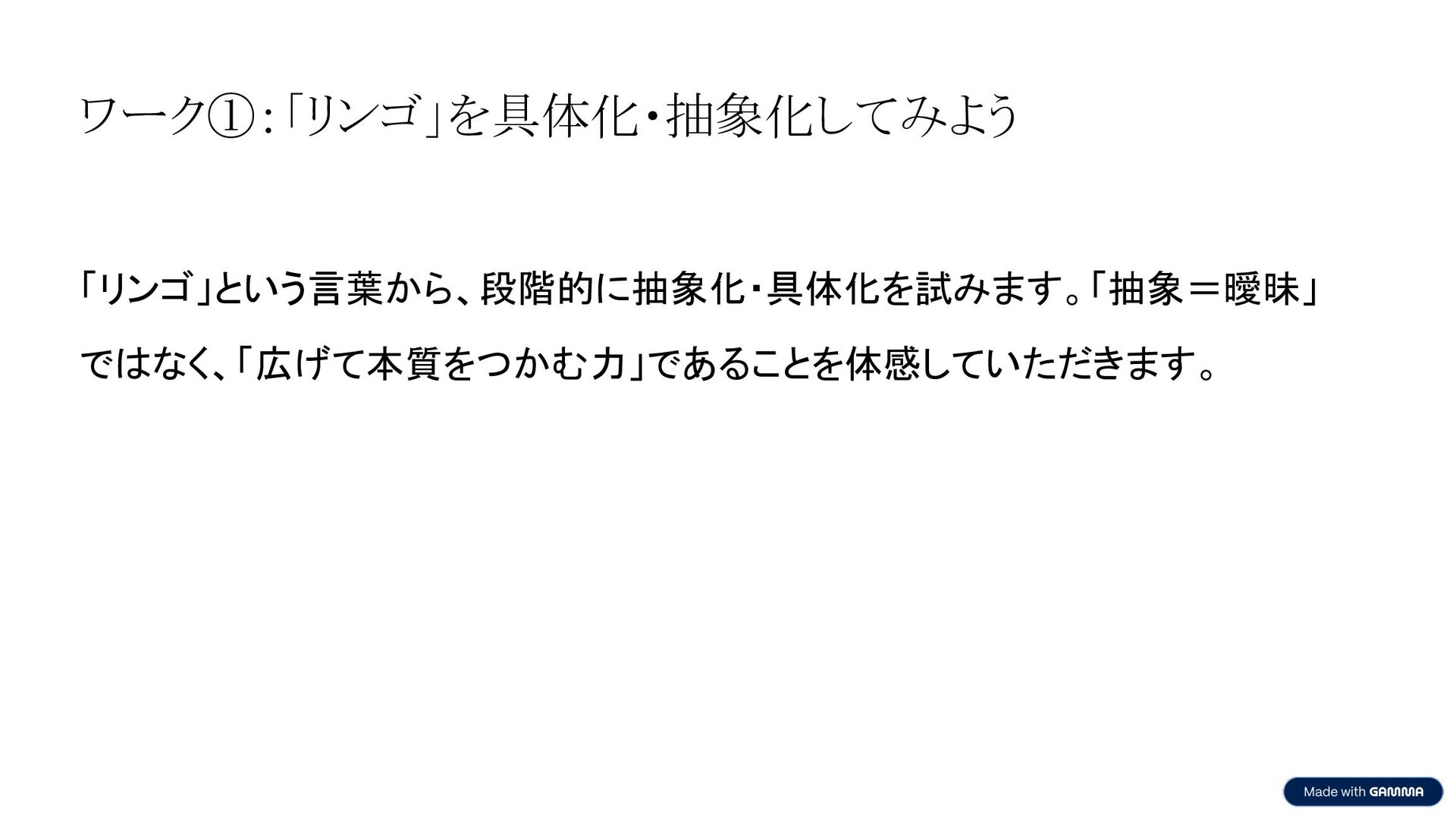 第1部:ウォームアップワーク ワーク①:「リンゴ」を具体化・抽象化してみよう 「リンゴ」という言葉から、段階的に抽象化・具体化を試みます。「抽象=曖昧」 ではなく、「広げて本質をつかむ力」であることを体感していただきます。