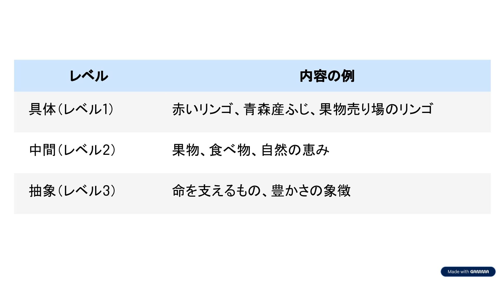 レベル 内容の例 具体(レベル1) 赤いリンゴ、青森産ふじ、果物売り場のリンゴ 中間(レベル2) 果物、食べ物、自然の恵み 抽象(レベル3) 命を支えるもの、豊かさの象徴