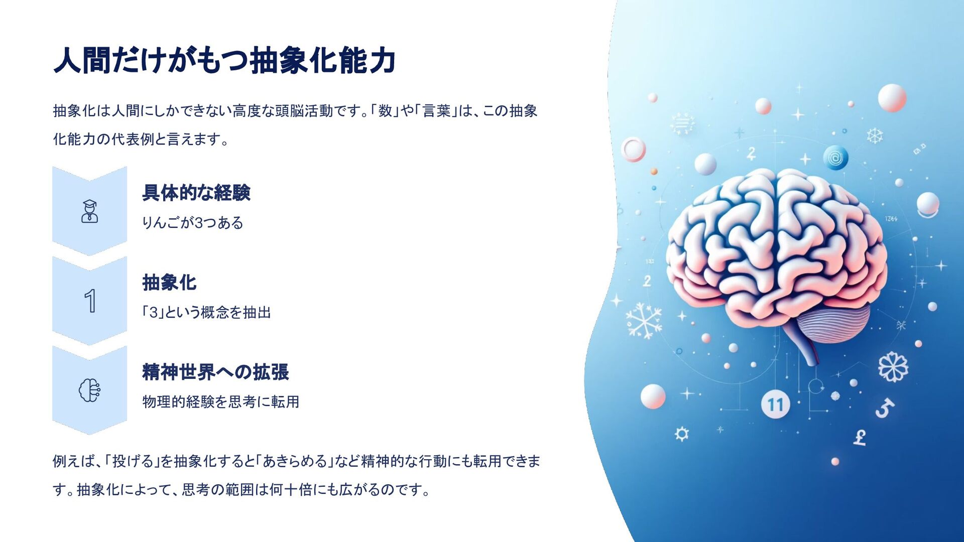 人間だけがもつ抽象化能力 抽象化は人間にしかできない高度な頭脳活動です。「数」や「言葉」は、この抽象 化能力の代表例と言えます。 具体的な経験 りんごが3つある 抽象化 「3」という概念を抽出 精神世界への拡張 物理的経験を思考に転用 例えば、「投げる」を抽象化すると「あきらめる」など精神的な行動にも転用できま