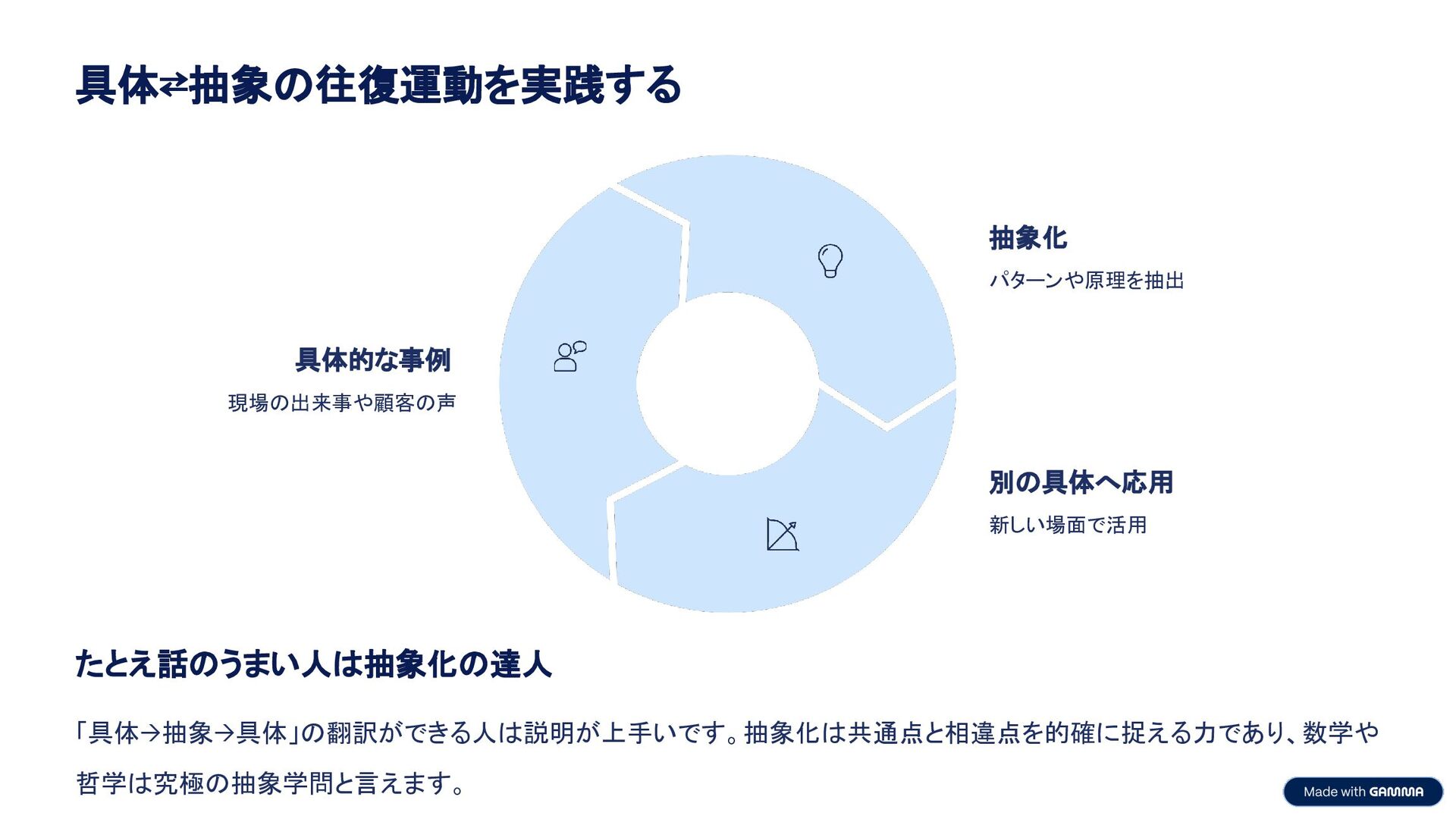 具体⇄抽象の往復運動を実践する 具体的な事例 現場の出来事や顧客の声 抽象化 パターンや原理を抽出 別の具体へ応用 新しい場面で活用 たとえ話のうまい人は抽象化の達人 「具体→抽象→具体」の翻訳ができる人は説明が上手いです。抽象化は共通点と相違点を的確に捉える力であり、数学や 哲学は究極の抽象学問と言えます。