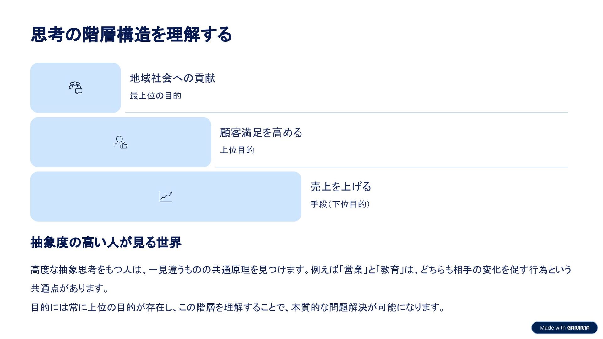 目的には常に上位の目的が存在し、この階層を理解することで、本質的な問題解決が可能になります。