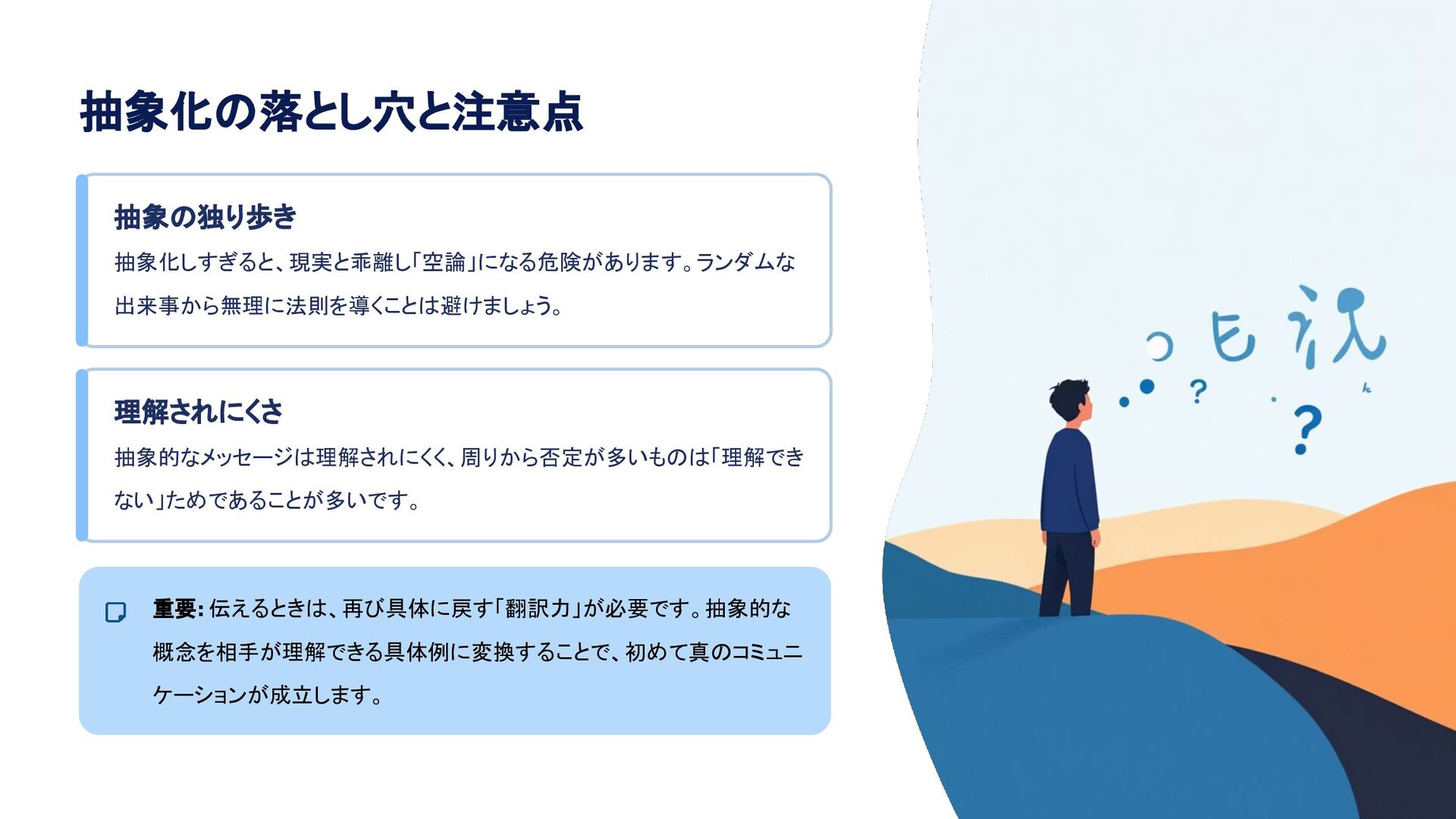 抽象化の落とし穴と注意点 抽象の独り歩き 抽象化しすぎると、現実と乖離し「空論」になる危険があります。ランダムな 出来事から無理に法則を導くことは避けましょう。 理解されにくさ 抽象的なメッセージは理解されにくく、周りから否定が多いものは「理解でき ない」ためであることが多いです。 重要: 伝えるときは、再び具体に戻す「翻訳力」が必要です。抽象的な 概念を相手が理解できる具体例に変換することで、初めて真のコミュニ