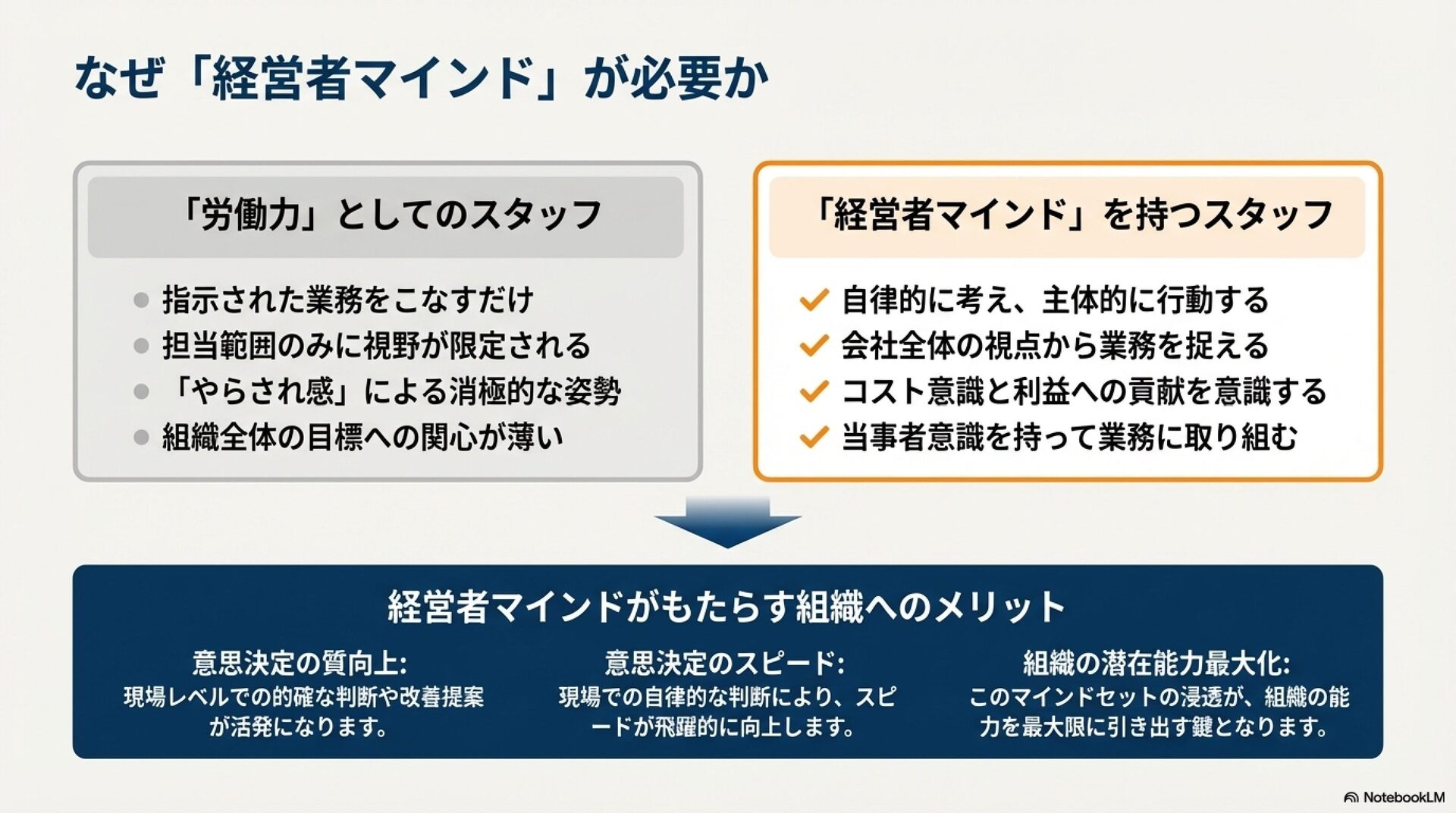 スタッフの方も経営者がどういう考えを持っているかを理解することは、仕事の期待値に応えるためにも必要だと考えます。