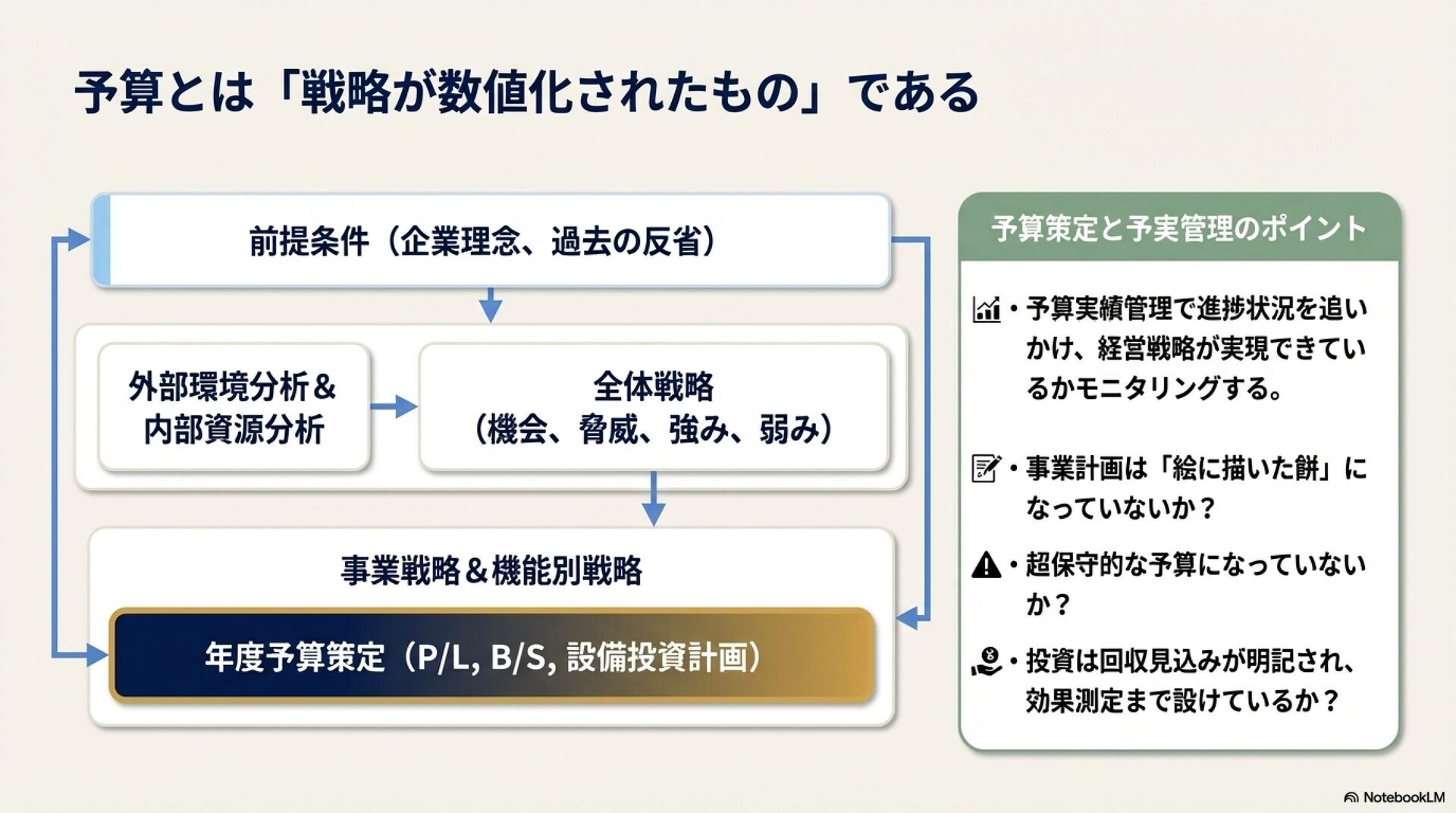 会社を運営するにあたって、会計理解は必要ですが簿記を理解するだけでは十分ではありません。 戦略からどう予算を作成し、管理していくべきか?すぐれた会社はこの管理が秀逸です。 自分の今までの経験を踏まえて資料化したので、ご参考ください。