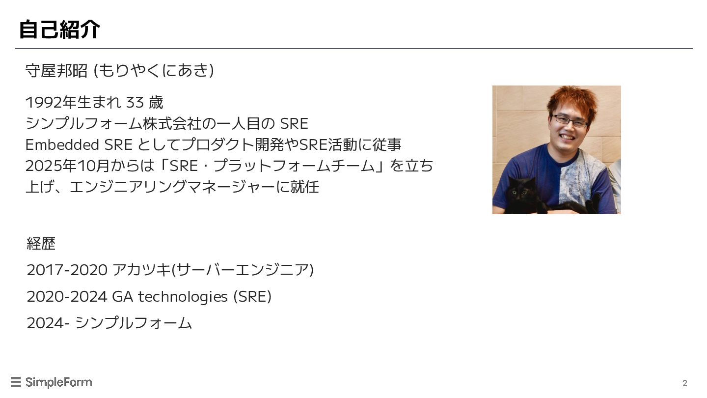 2024- シンプルフォーム 1992年生まれ 33 歳 シンプルフォーム株式会社の一人目の SRE Embedded SRE としてプロダクト開発やSRE活動に従事 2025年10月からは「SRE・プラットフォームチーム」を立ち 上げ、エンジニアリングマネージャーに就任 2