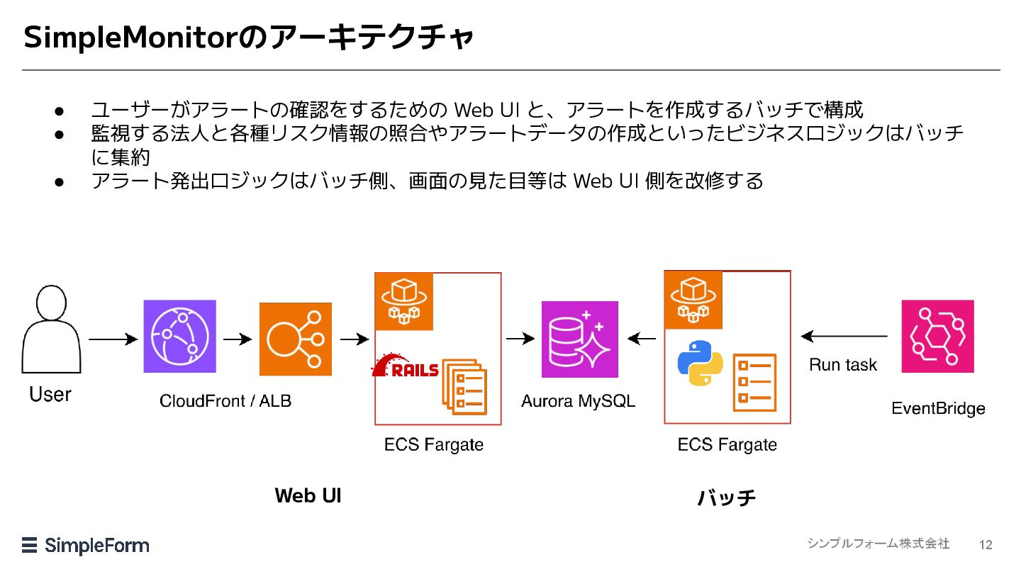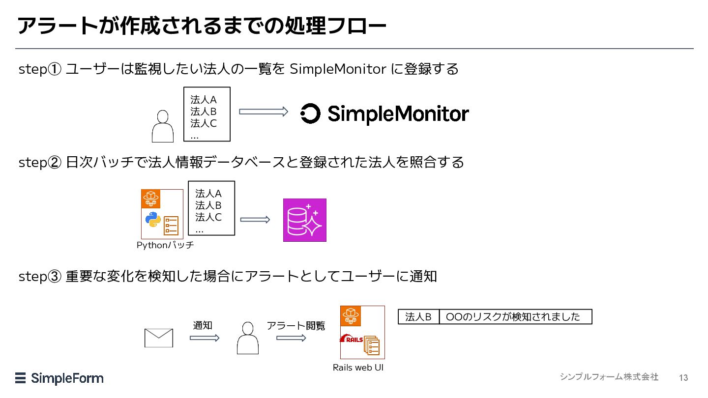 シンプルフォーム株式会社 SimpleMonitorのアーキテクチャ 12 • ユーザーがアラートの確認をするための Web UI と、アラートを作成するバッチで構成 • 監視する法人と各種リスク情報の照合やアラートデータの作成といったビジネスロジックはバッチ