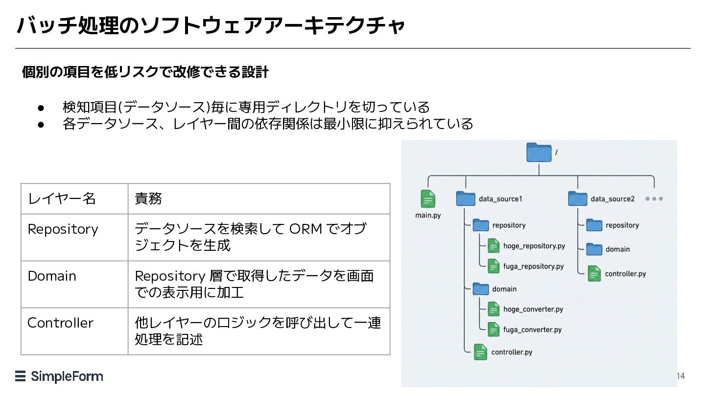 シンプルフォーム株式会社 バッチ処理のソフトウェアアーキテクチャ 14 • 検知項目(データソース)毎に専用ディレクトリを切っている • 各データソース、レイヤー間の依存関係は最小限に抑えられている レイヤー名 責務 Repository