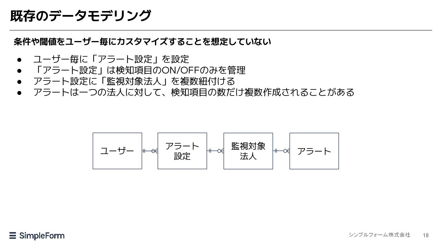 シンプルフォーム株式会社 リアーキテクチャで目指す要件 17 • 新しい検知項目をより少ない開発工数で追加できること • 複数の検知項目を組み合わせた複合条件でアラートを作成できること • ユーザー毎にアラートを上げる条件(閾値)をカスタマイズできること データモデリングから再考が必要